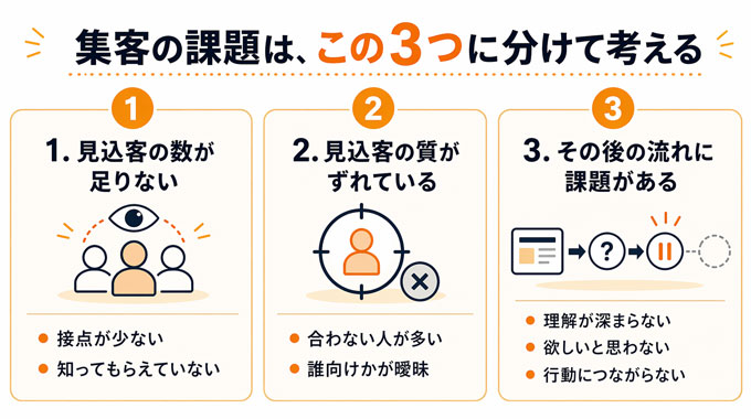それにもかかわらず、ひとまとめにして「もっと発信しないと」「もっと人を集めないと」と考えてしまうと、打ち手がずれやすくなります。実際には、集客の課題は大きく3つに分けて考える必要があります。