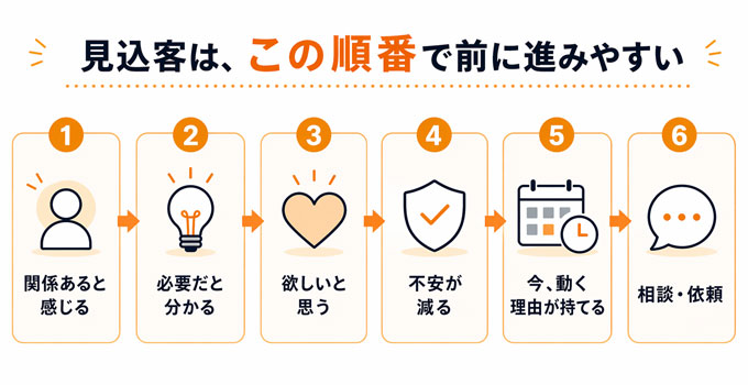特に見落とされやすいのが、見込客がその後どう進んでいくかという視点です。関係あると感じる。必要性が分かる。欲しいと思う。不安が減る。今、動く理由が持てる。こうした気持ちの流れがなければ、見込客との接点があっても、成果にはつながりにくくなります。