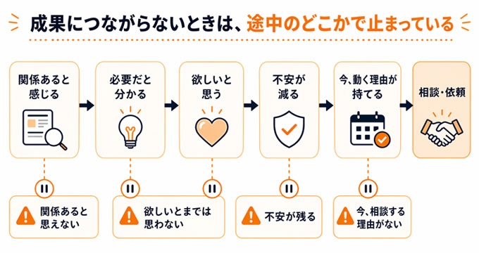 この流れが自然につながって、はじめて相談や依頼という行動に進みやすくなります。